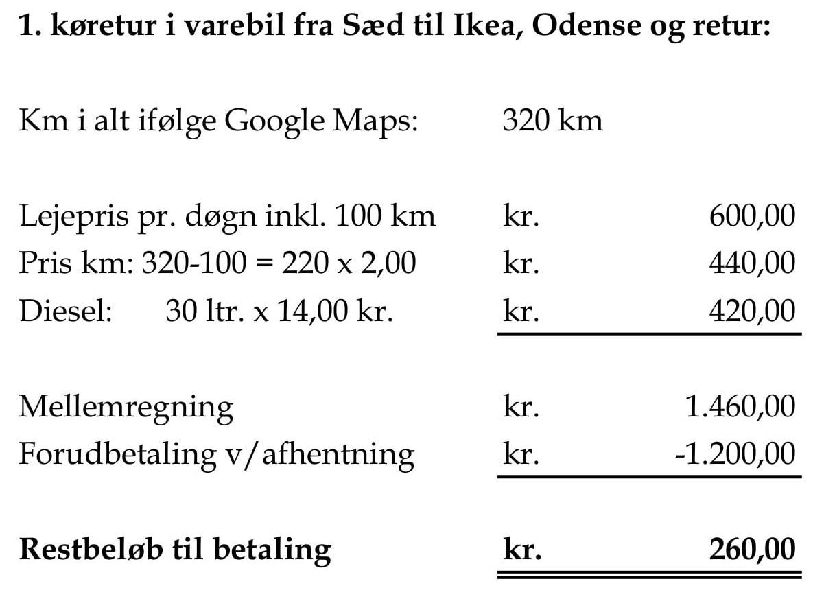 I dette hypotetiske scenarie lejes bilen 1 døgn til en tur til Ikea i Odense, en strækning på 320 km.